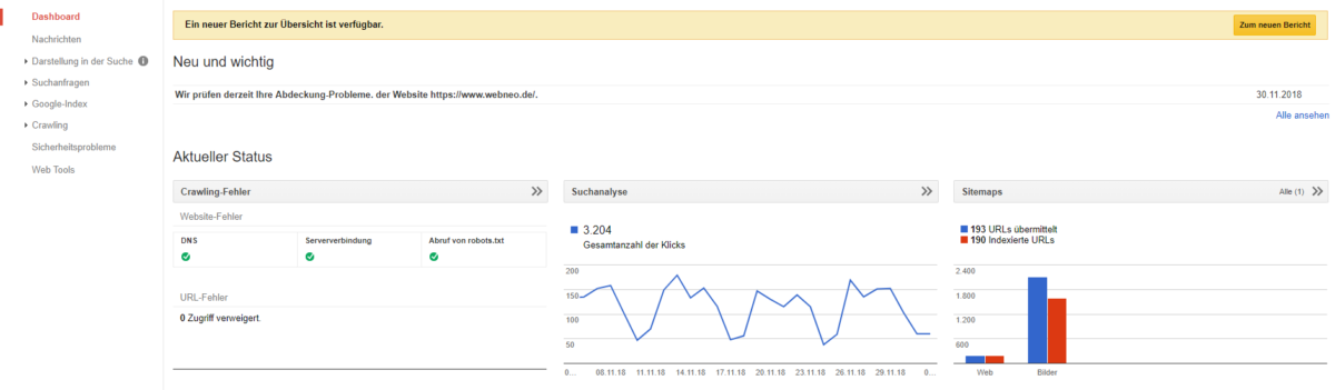 Ähnlich gut ist auch die Übersicht in der neuen Search Console, wo von den oben genannten Statistiken einen ähnlich aufbereiteten aktuellen Status über einzelnen Kennzahlen auf einen Blick auf der Startseite der GSC angezeigt wird: