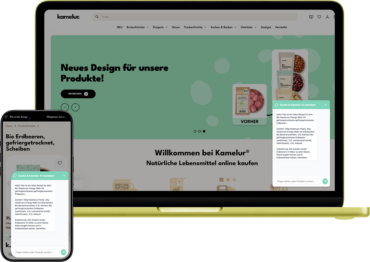 Kamelur haben wir fit für die Zukunft des digitalen Handels gemacht. Das Ziel war es, den Kunden nicht mit einer einfachen Suchfunktion allein zu lassen, sondern ihm einen intelligenten KI-Assistenten an die Seite zu stellen, der ihn wie ein echter Fachberater durch das Sortiment führt.